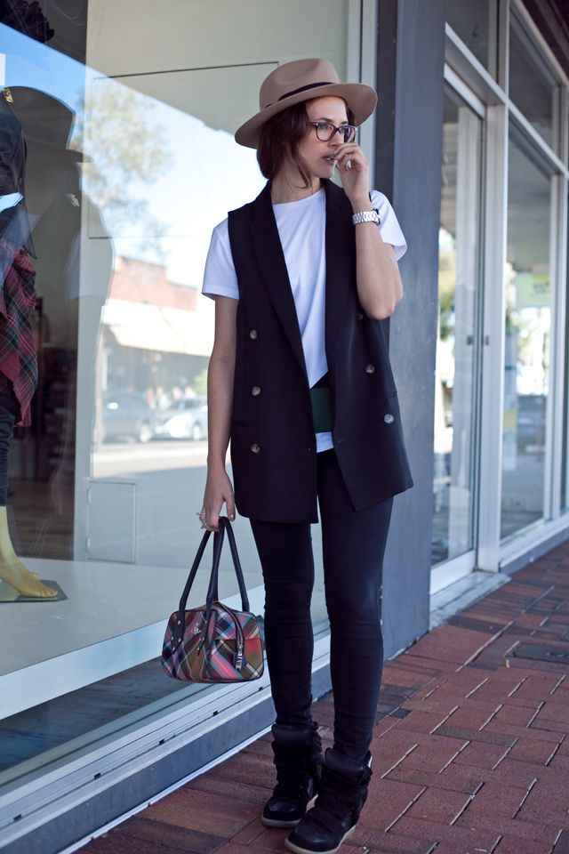 Seed Heritage Waistcoat (similar by Wish here), Saba Flag Print T-Shirt, Dr. Denim Jeans, Isabel Marant Bekket Sneakers, Lack Of Color Fedora, Tom Ford Glasses.